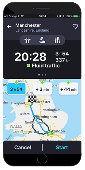 Aplikacja Coyote uwzględnia natężenie ruchu w czasie rzeczywistym. W przypadku korków, Aplikacja Coyote automatycznie zaproponuje nową trasę.