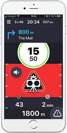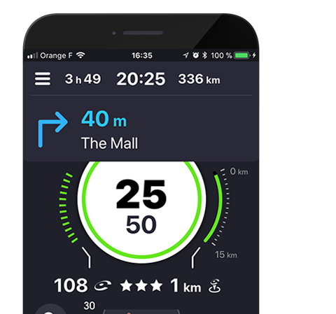 Otrzymuj na bieżąco informacje o prędkości chwilowej i obowiązującym ograniczeniu prędkości. W przypadku przekroczenia licznik prędkości zmienia się z koloru zielonego na czerwony.
